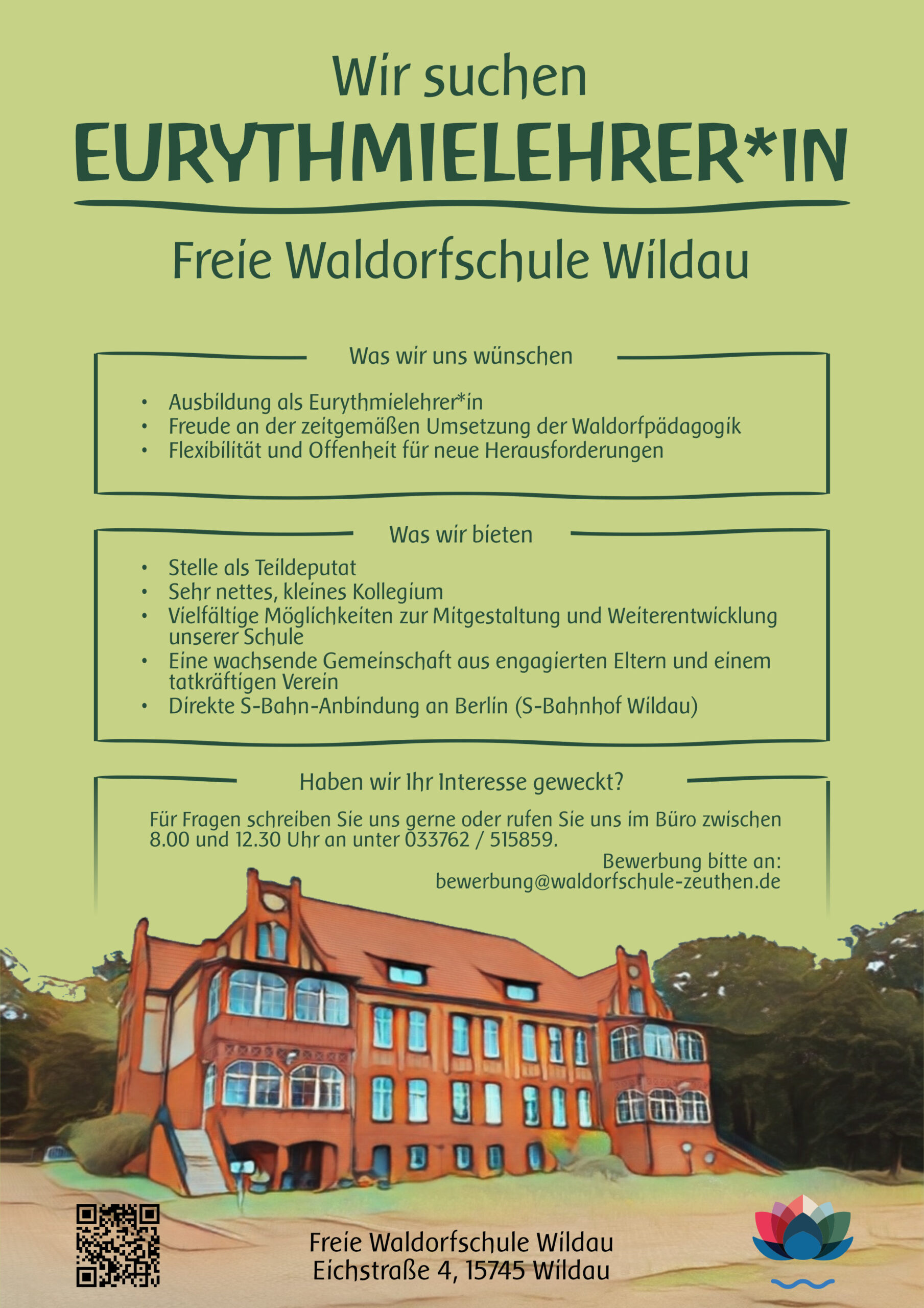 Die Waldorfschule Wildau (bei Berlin) befindet sich im wunderschönen und wasserreichen Dahme- Spreewald Gebiet. Durch den S-Bahnhof Wildau ist Sie sehr gut an Berlin angebunden. Als junge Schule leben wir das Miteinander und bieten viel Raum zur Mitgestaltung. Hier haben Sie in einem kleinen Team die Möglichkeit, Ihre Erfahrungen und Ideen einzubringen.